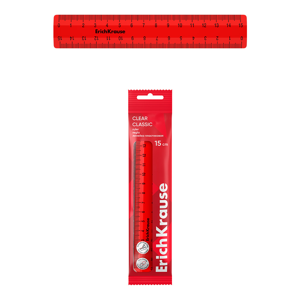 Линейка пластиковая ErichKrause Classic, 15см, флоупак, красный (в пакете по 20 шт) |