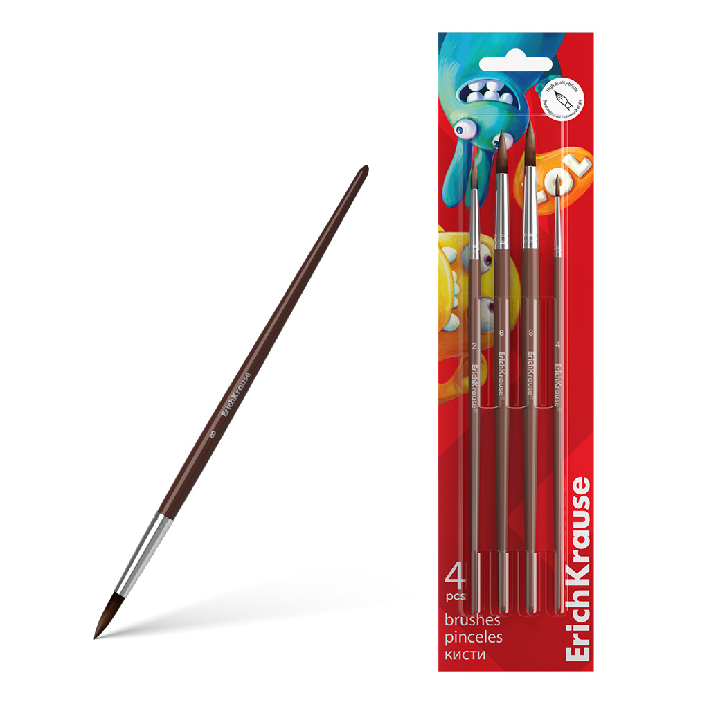 Кисти ErichKrause Jolly Friends для акварели и гуаши, пони, 4 штуки (в блистере) |