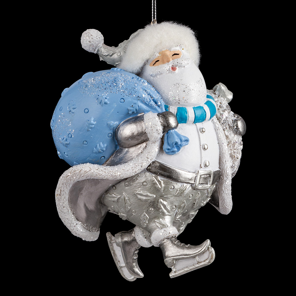 Дед Мороз в необычном серебряном одеянии катается на коньках. Шапка оторочена белым мехом. Большой мешок с подарками декорирован орнаментом из елочек. Сочетание голубого и серебряного цвета наполняет дом радостным предвкушением праздника и волшебства. Украшение является относительно тяжелым, предпочтительно использование на искусственной елке. Групповая упаковка предназначена только для безопасной транспортировки и хранения. |