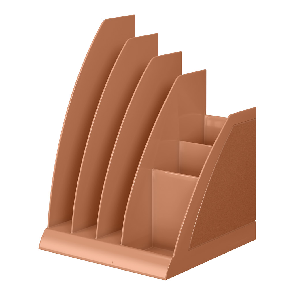 Настольная подставка с отдельными секциями для хранения как документов, журналов и каталогов любого формата, так и канцелярских принадлежностей. Изготовлена из высококачественного пластика. |