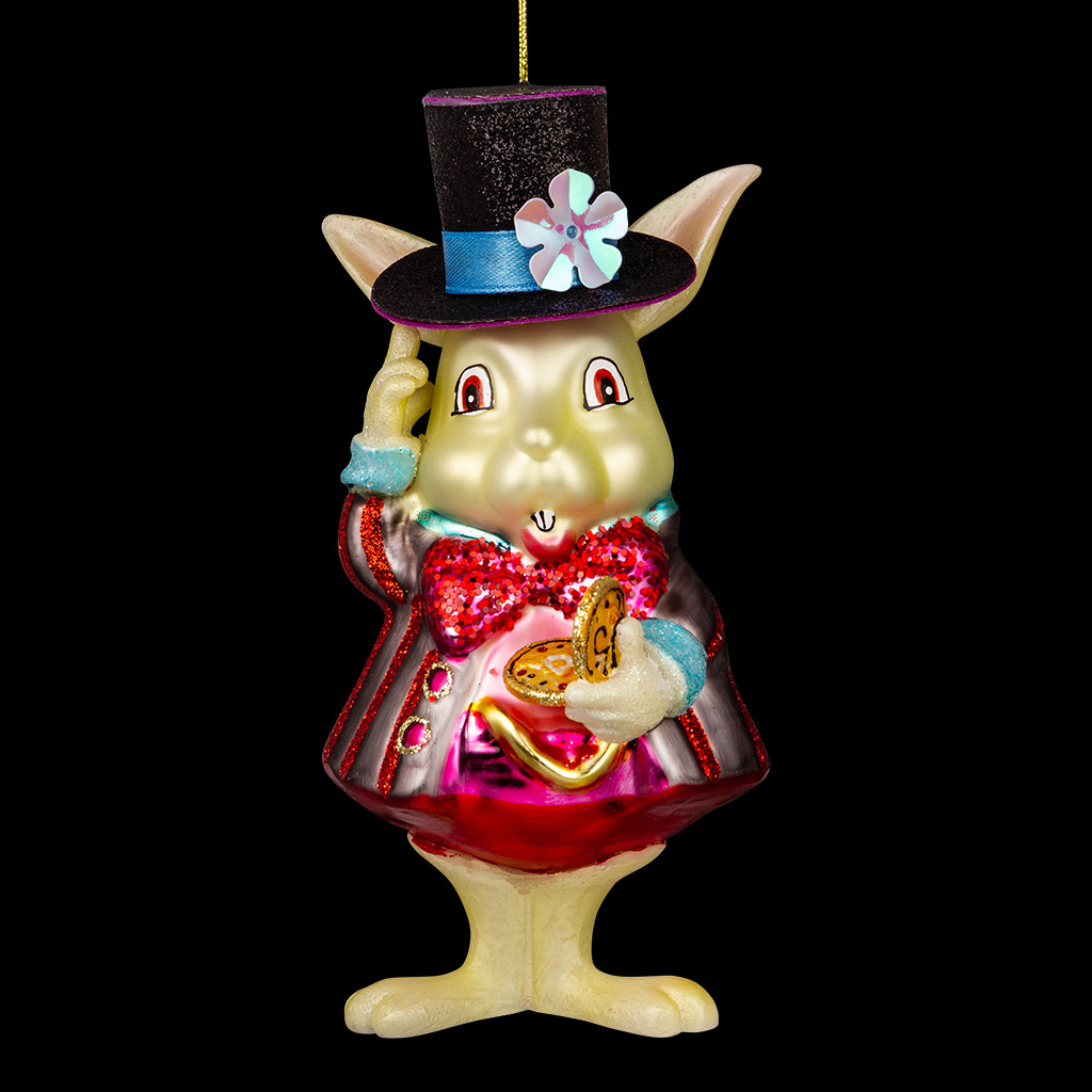 Мартовский Заяц из сказки Алиса в Стране Чудес станет особым украшением на праздничной елке. Изделие выполнено из стекла высокого качества, костюм восхищает сверкающими красками. Лапы и уши персонажа сделаны из полирезины, что позволяет максимально точно передать их детализацию. Цилиндр выполнен из фетра и декорирован шелковой лентой. Сказочные герои красиво смотрятся и создают уютную атмосферу дома. Когда они собираются вместе, то интересно дополняют друг друга. Изделие отличается крупным размером и является относительно тяжелым, предпочтительно использование на искусственной елке. Групповая упаковка предназначена только для безопасной транспортировки и хранения. |