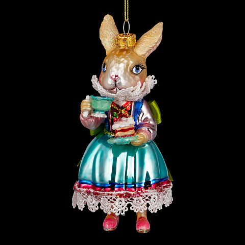 Зайчиха из сказки Алиса в Стране Чудес станет особым украшением на праздничной елке. В одной лапке она держит чашку чая, в другой - кусок торта. Изделие выполнено из стекла высокого качества, костюм восхищает сверкающими красками. Лапы и уши персонажа сделаны из… |