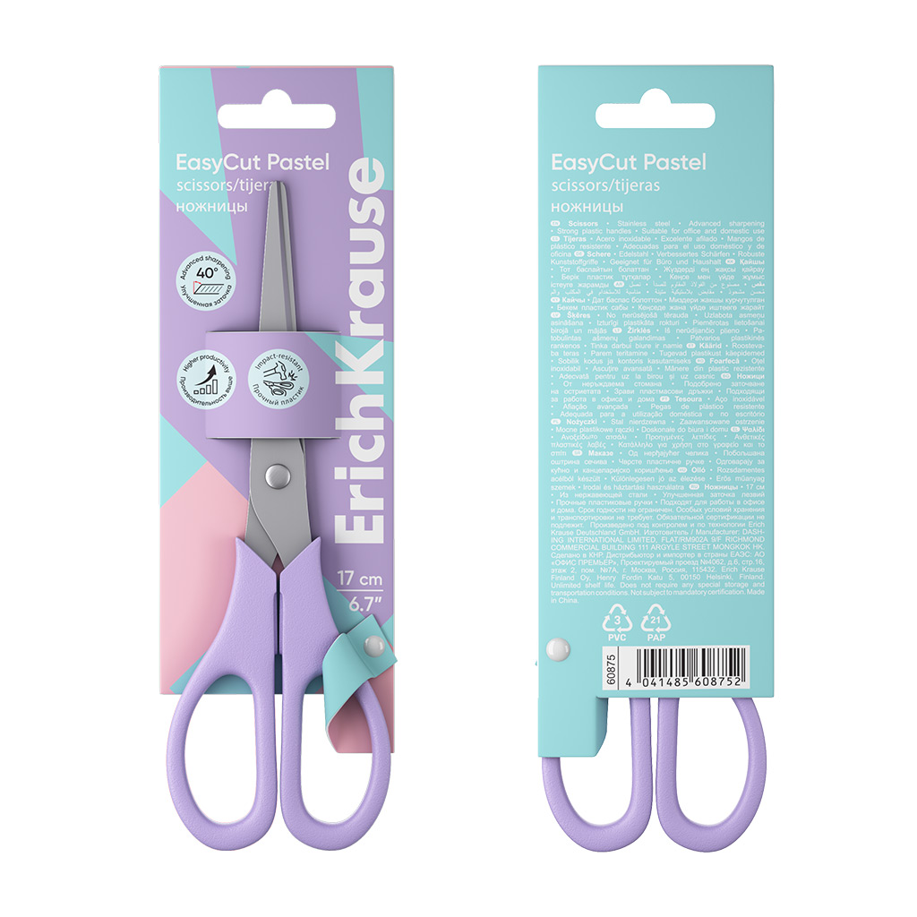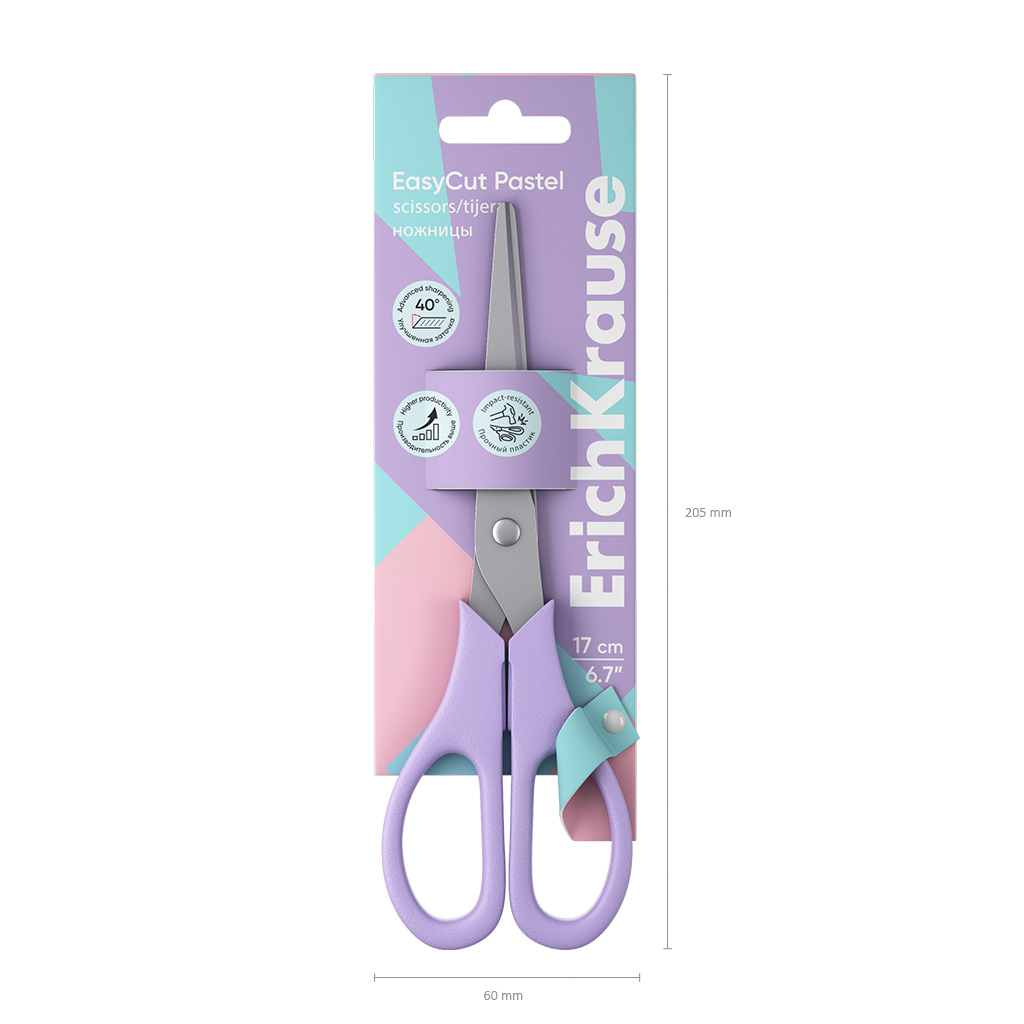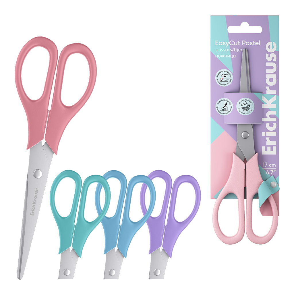 | Полное наименование товара: | Ножницы ErichKrause EasyCut Pastel, 17 см, ассорти (в дисплее по 24 шт.) |