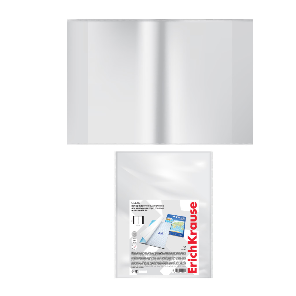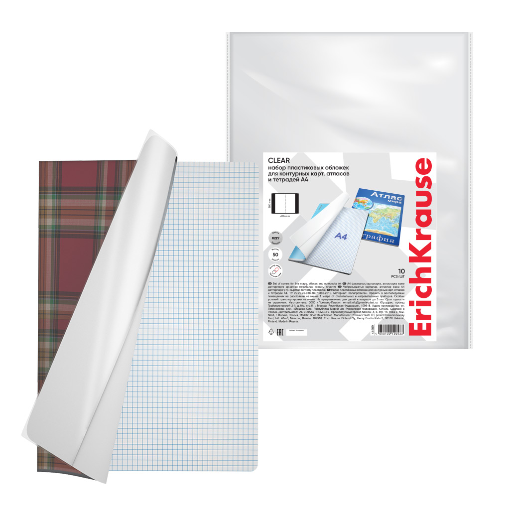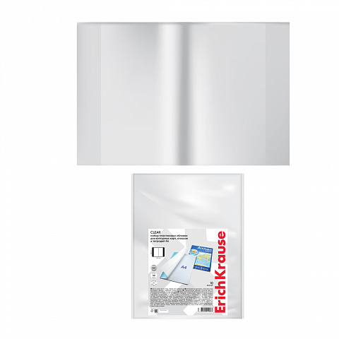 Набор пластиковых обложек ErichKrause Fizzy Clear, для контурных карт, атласов и тетрадей A4, 306х426мм, 50 мкм (пакет 10 шт.)