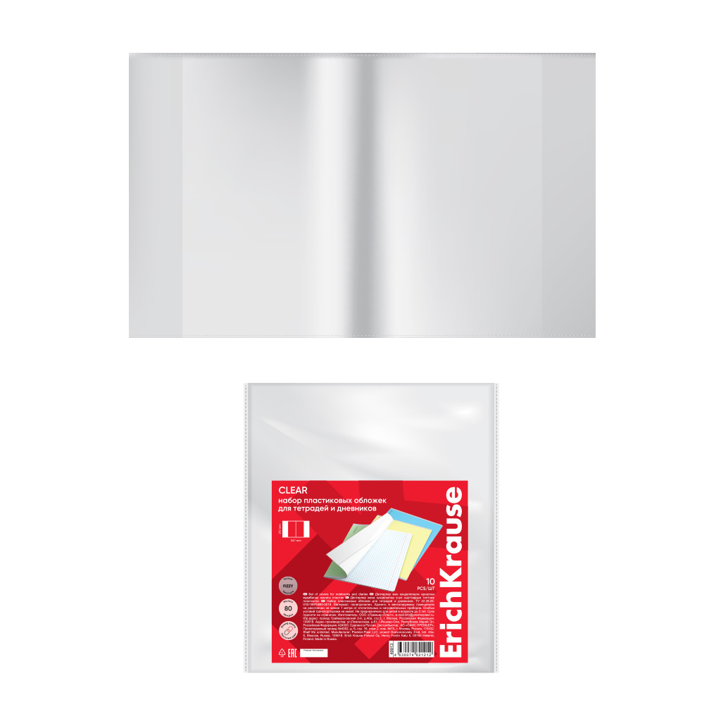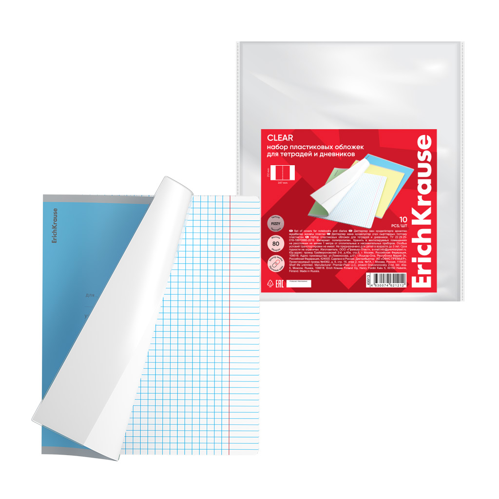 Набор пластиковых обложек ErichKrause Fizzy Clear, для тетрадей и дневников, 212х347мм, 80 мкм (пакет 10 шт.) |
