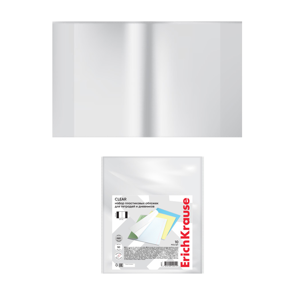 Набор пластиковых обложек ErichKrause Fizzy Clear, для тетрадей и дневников, 212х347мм, 50 мкм (пакет 10 шт.) |