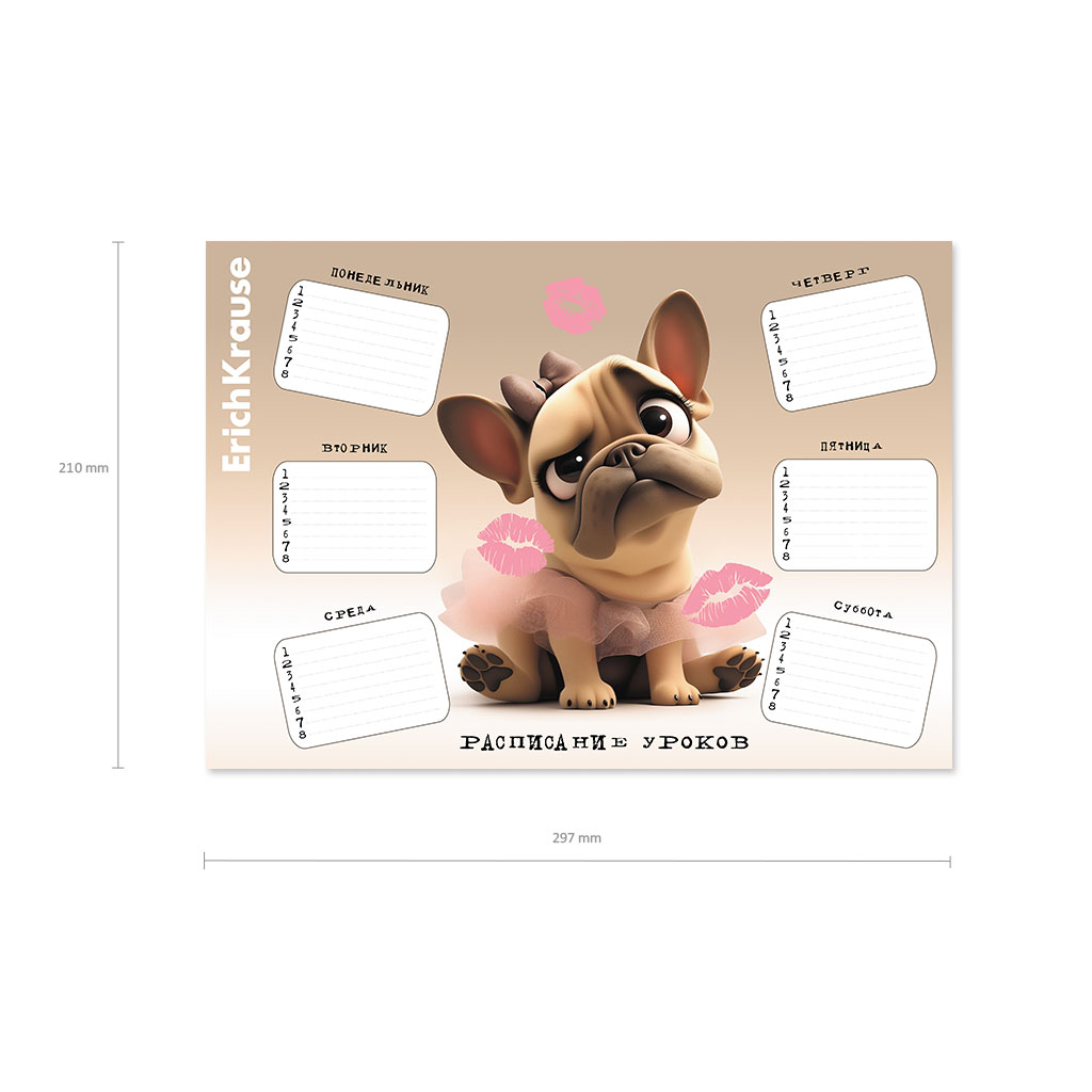 Расписание уроков формата А4 (210х297 мм). Плотный мелованный картон 170 г/м2. Шестидневная учебная неделя. Каждый день содержит 8 строк для записи. Расписания уроков упакованы в термоусадочную пленку по 100 штук. |