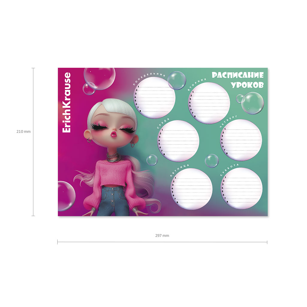 Расписание уроков формата А4 (210х297 мм). Плотный мелованный картон 170 г/м2. Шестидневная учебная неделя. Каждый день содержит 8 строк для записи. Расписания уроков упакованы в термоусадочную пленку по 100 штук. |
