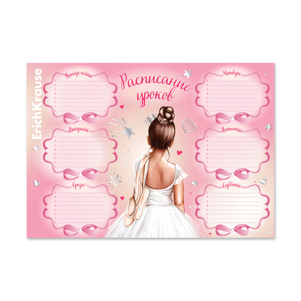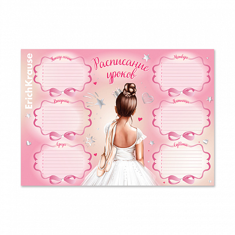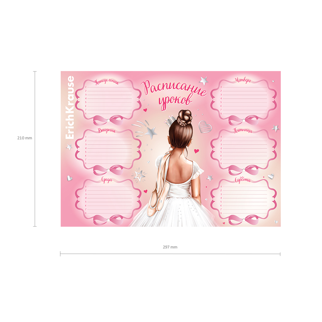 Расписание уроков формата А4 (210х297 мм). Плотный мелованный картон 170 г/м2. Шестидневная учебная неделя. Каждый день содержит 8 строк для записи. Расписания уроков упакованы в термоусадочную пленку по 100 штук. |