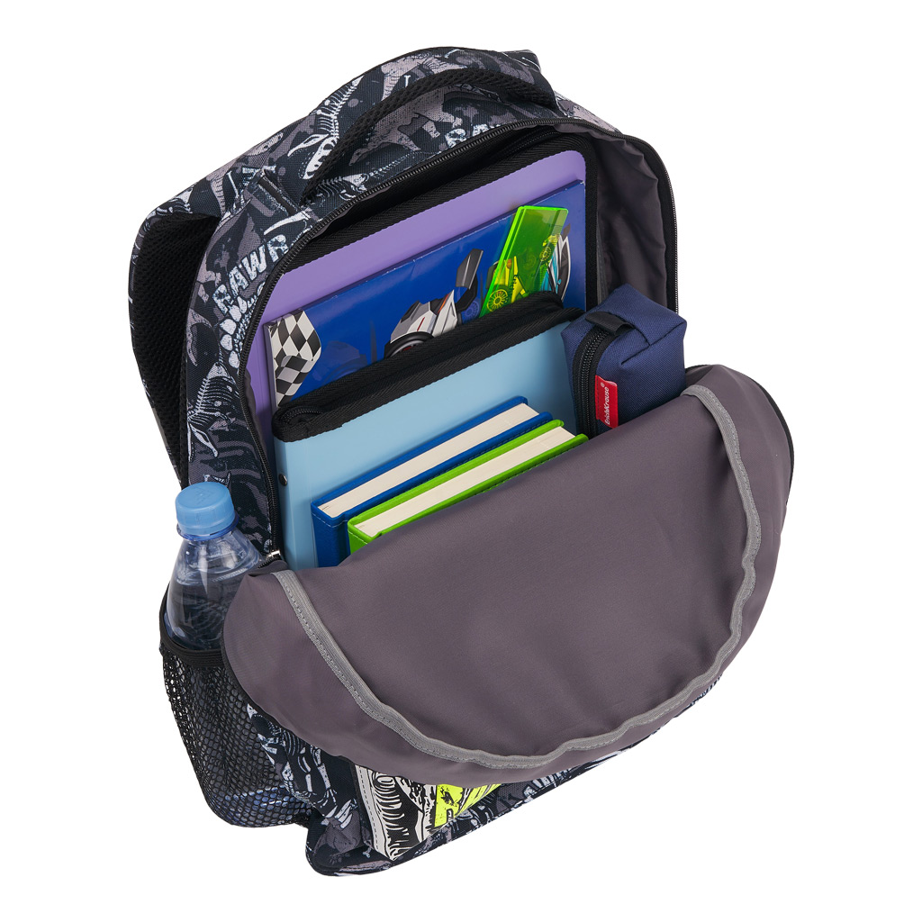 Модель увеличенного объёма 20 л и размерами 44x23x33см, при этом она очень лёгкая, всего 420 г, и изготовлена из износо- и морозостойкого водоотталкивающего 100% полиэстера 600D. В рюкзаке имеется два вместительных отделения на молнии формата А4+. Основное отделение также включает мини-органайзер. Снаружи есть большой фронтальный карман на молнии и два боковых из однослойной сетки. Мягкая спинка модели, её широкие анатомические лямки из воздухопроницаемого материала AirMesh и нагрудный фиксатор способствует равномерному распределению нагрузки по всему телу ребёнка. Объёмная и мягкая ручка обеспечивает комфортную переноску, а места крепления лямок и ручки усилены дополнительными швами. Отделения и основной карман оснащены высококачественной плавной молнией. Светоотражающие элементы интегрированы в лямки рюкзака. Эта вместительная модель отлично подходит для занятий в школе, она лёгкая, долговечная, что в целом делает ее очень практичной. |