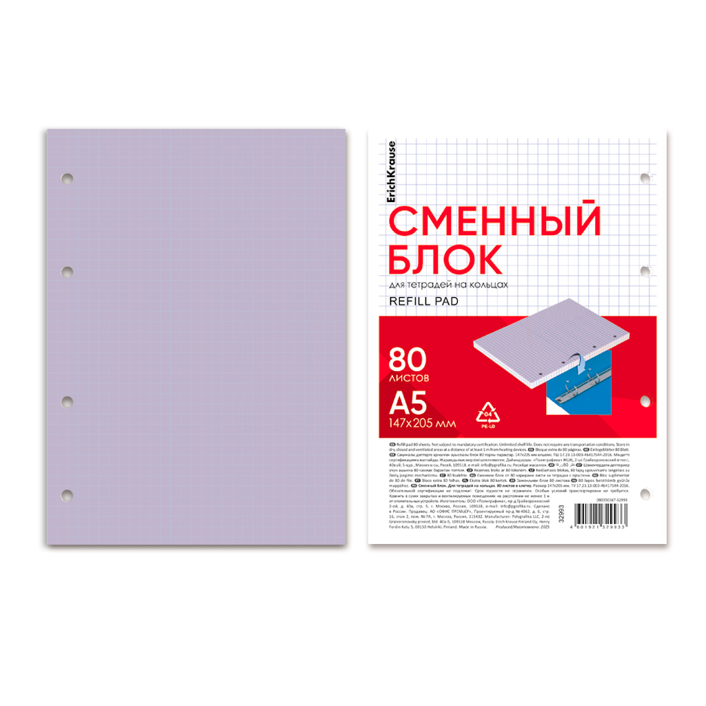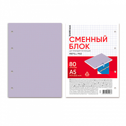 Сменный блок для тетради на кольцах ErichKrause, А5, 80 листов, клетка, фиолетовый