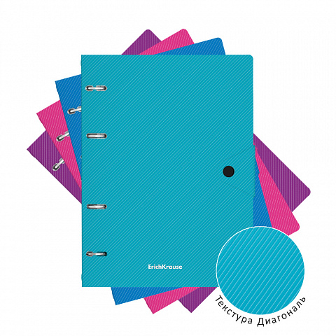 Тетрадь общая формата А5 (147x205 мм). Обложка из высококачественного износостойкого глянцевого пластика с фактурой «даймонд». Яркие цвета обложки. В блоке 80 листов в клетку. Бумага офсетная плотностью 60 г/м2. Цвет линовки - синий. Скругленные уголки обложки. Тип скрепления - кольца. Обложка фиксируется клапаном с кнопкой. Прорези под кольца оснащены фиксаторами. Товар поставляется в нескольких вариантах цвета без возможности выбора. |