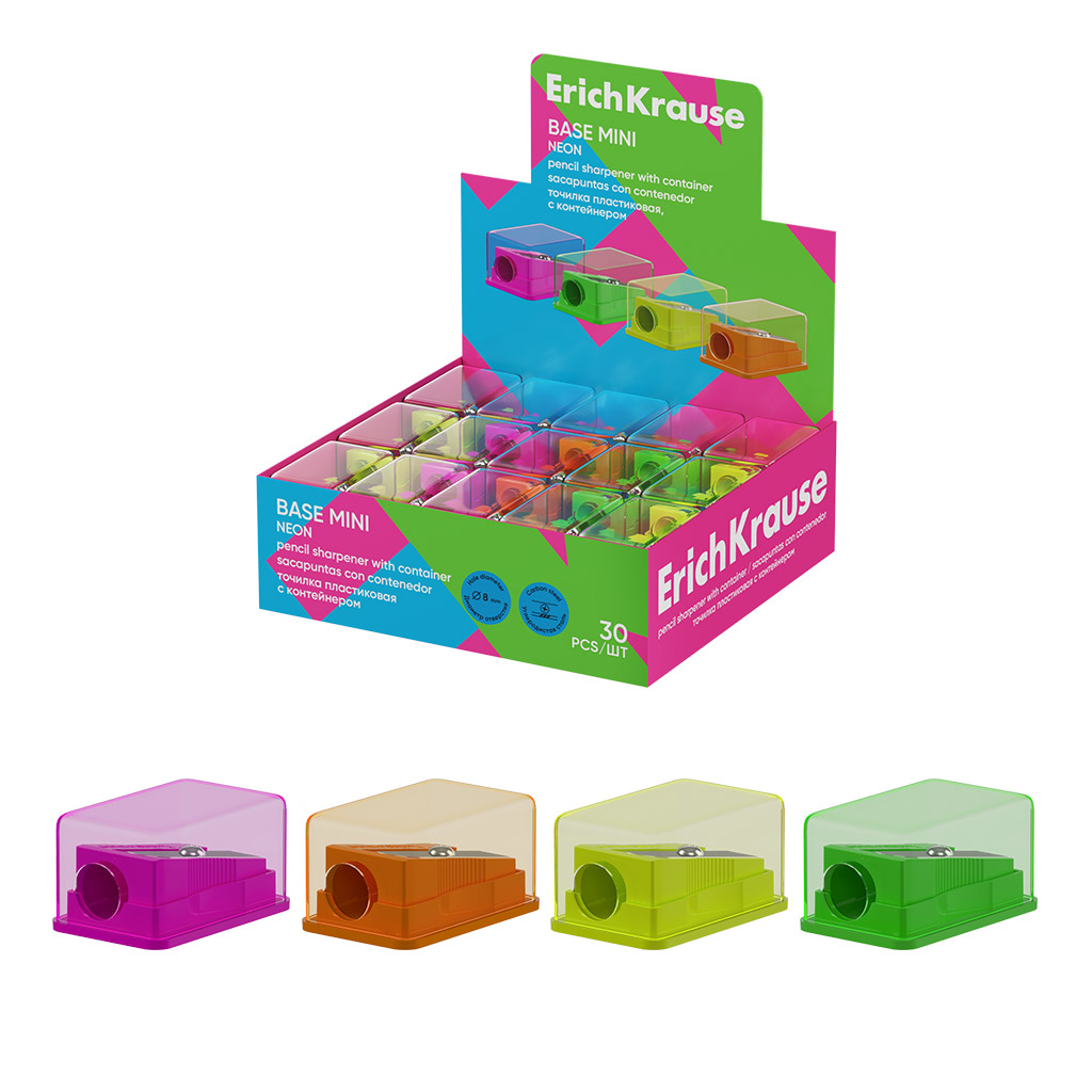 Точилка пластиковая ErichKrause Base Mini, Neon, с контейнером, ассорти (в коробке-дисплее по 30 шт) |