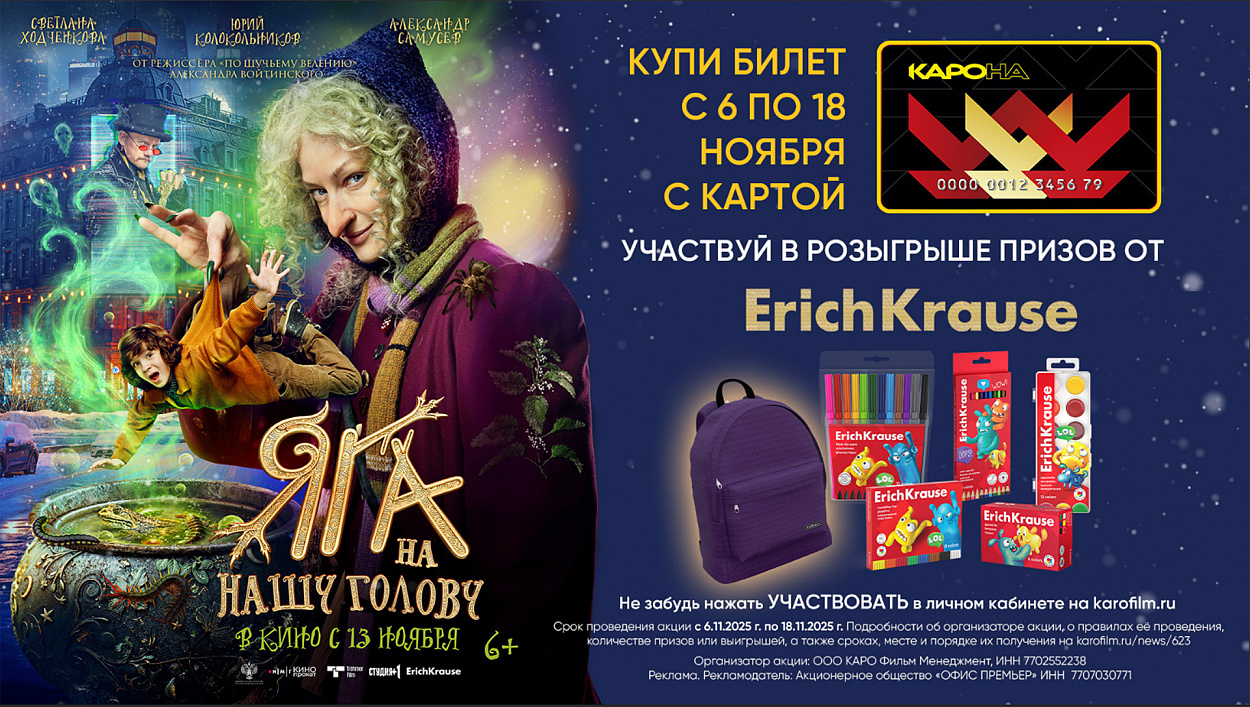 С 13 ноября в российских кинотеатрах стартовал прокат семейной сказки «Яга на нашу голову». Волшебная комедия о приключениях знакомых героев русских сказок в новом прочтении ожидает зрителей, чтобы рассказать и показать историю чуда в современном мире. Картина, предназначенная для семейного просмотра, несёт добро и эмоции, которые откликаются каждому, именно поэтому бренд ErichKrause стал официальным спонсором нового проекта. Канцтовары занимают отдельное место в сюжете, ведь они помогают маленькому герою в школьных буднях и приключениях, подчёркивая одну из главных ценностей компании — сделать дни современного ребёнка ярче, интереснее и комфортнее.