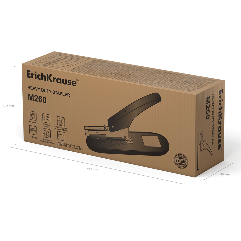 Heavy-duty stapler for high volume of documents produced and equipped with high quality steel mechanism. Have two types of stapling: temporary and permanent. Maximum volume of stapling 210 sheets by using 23/24 staples. Capacity of 100 staples №24/6, 23/6, 23/8, 23/10, 23/13, 23/15, 23/17, 23/20, 23/23. A rear loading staples mechanism. Plastic base pad prevents table surface from scratching and helps to avoid slipping of the stapler. Adjustable distance to the fastening point. Paper insertion depth 76mm. Mechanism 2 year guarantee when using ErichKrause® staples. |