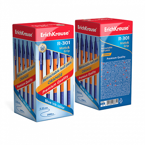 Retractable ballpoint pen ErichKrause R-301 Matic&Grip Orange 0.7, ink color: blue (box 50 pcs.) |