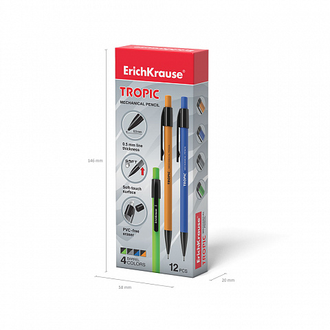 Lapiz mecanico redondo con boquilla retractil y una revestimiento Soft Touch. Carcasa en colores mate brillantes. Con borrador, capuchon y un comodo clip. Dureza HB. Minas de 0.5 mm de diametro.