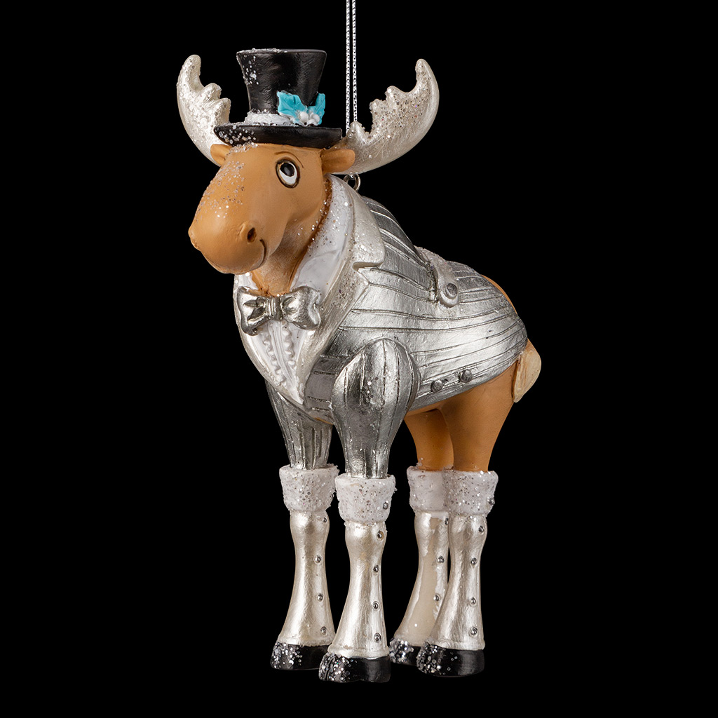 Мистер Лось одет в элегантное пальто серебряного цвета и лаконичный цилиндр. Теплые гетры на копытах не дадут ему замерзнуть. Украшение отличается тонко прорисованными деталями. Изделие является относительно тяжелым, предпочтительно использование на искусственной елке… |
