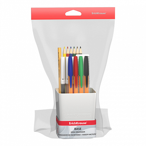 Готовый набор с наполнением. Универсальная подставка изготовлена из высококачественного пластика. В комплекте 6 предметов: 4 ручки, карандаш, линейка. Наполнение может отличаться от представленного. |