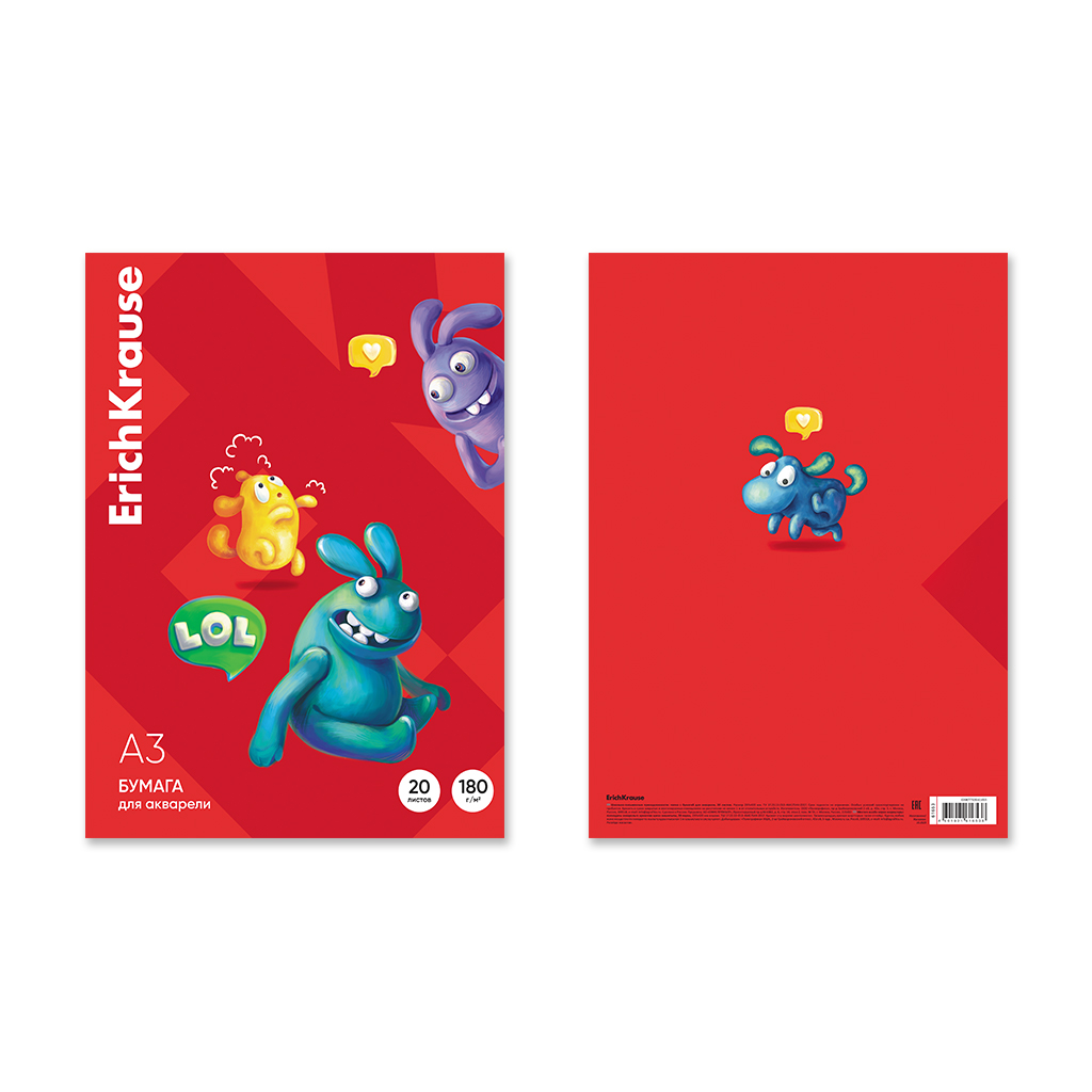Бумага для акварели в картонной папке ErichKrause Jolly Friends, А3, 20 листов |