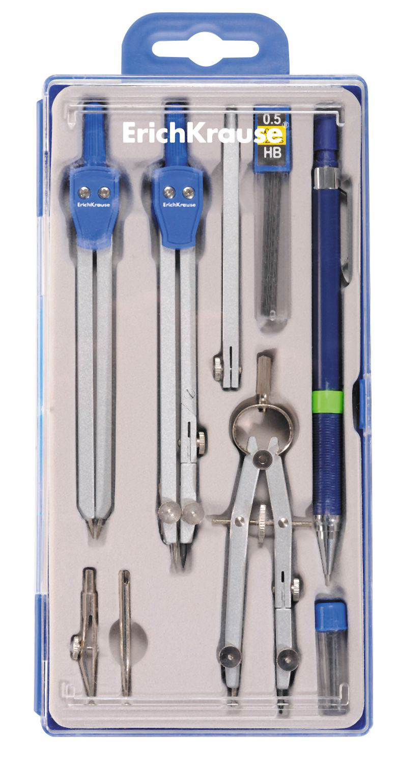 Набор для черчения. В комплект входят металлический циркуль с одной сгибаемой ножкой и максимальным радиусом 21.8см., циркуль-измеритель, кронциркуль, удлинитель, рейсфедер,запасной грифель для циркуля в пластиковом контейнере, запасная игла, механический карандаш с набор сменных грифелей. Упакован в удобный пластиковый футляр с европодвесом. |