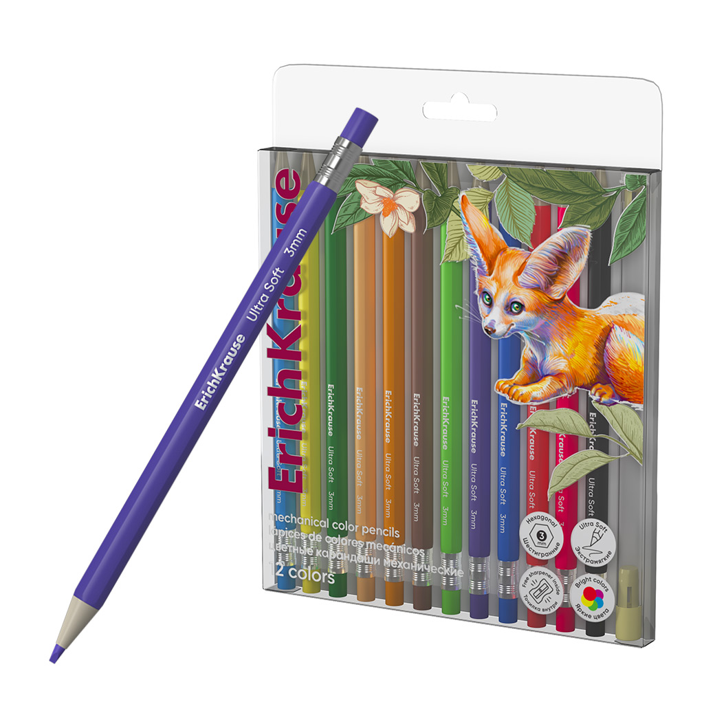 Цветные карандаши механические ErichKrause Safari шестигранные, грифель 3 мм, 12 цветов с точилкой (в ПЭТ-боксе с европодвесом 12 шт) |
