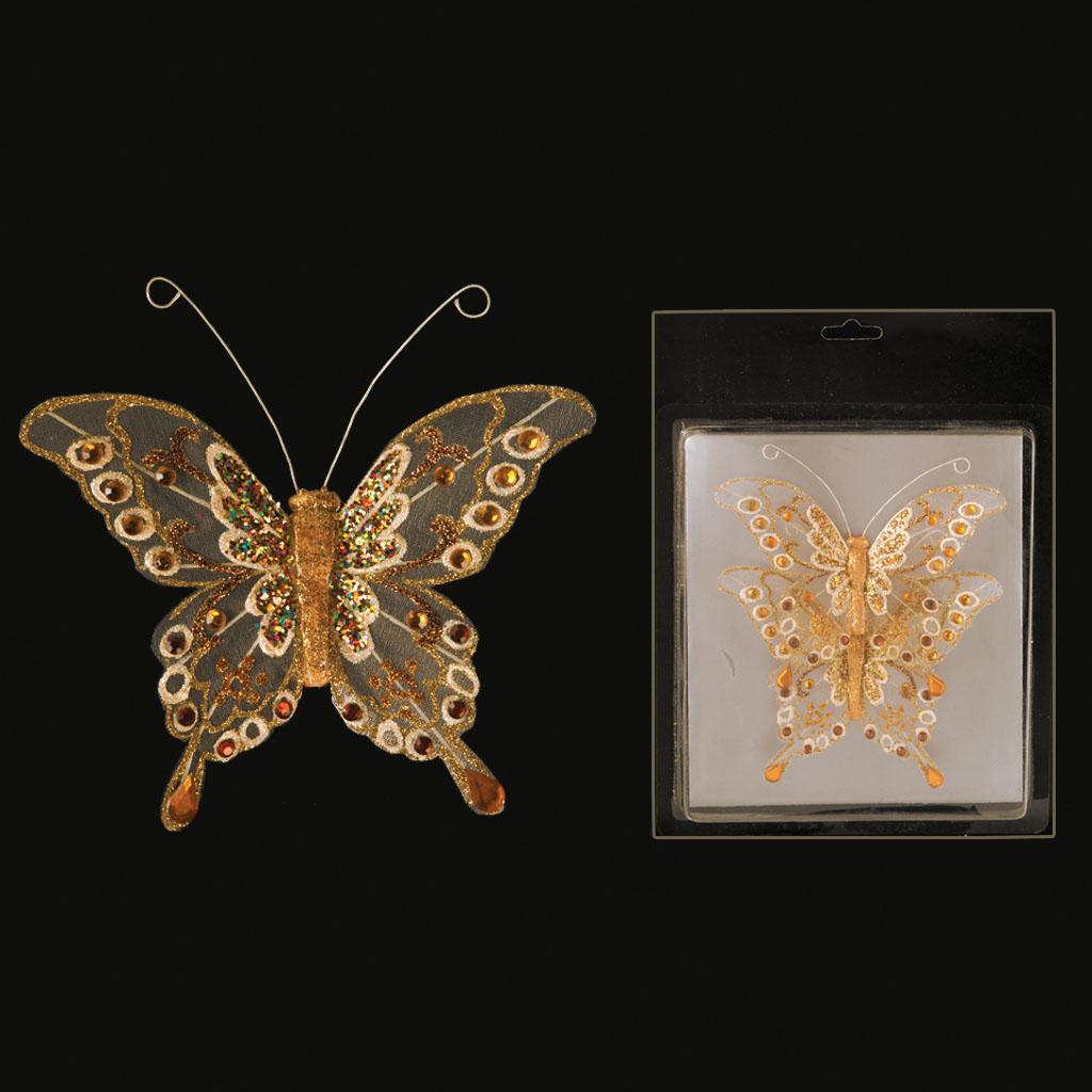 Две золотые бабочки на клипе прекрасно подходят для украшения елки, предметов интерьера, подарков, цветочных букетов, открыток и творческих работ. Упаковка - блистер. |