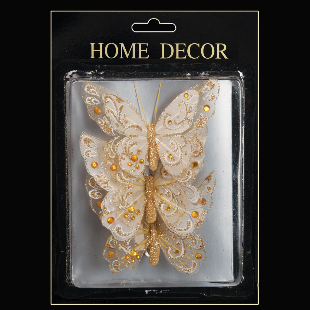 Текстильные бабочки золотистого цвета декорированы блестками и стразами. Прекрасно подходят для украшения елки, предметов интерьера, подарков, цветочных букетов, открыток и творческих работ. С оборотной стороны каждая бабочка оснащена металлической клипсой. Хороший размах крыльев. Упаковка - блистер. |