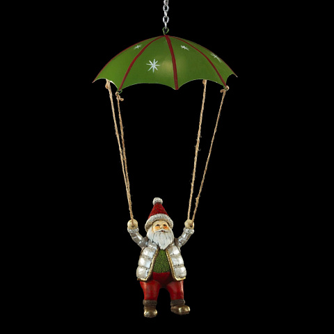 Оригинальное украшение в виде Санты, спускающегося на парашюте - необычное решение для праздничного декора. С помощью крючка на цепочке украшение легко крепится в любое подходящее место и меняет интерьер. Фигурка Санты выполнена из полирезины, парашют - из металла… |