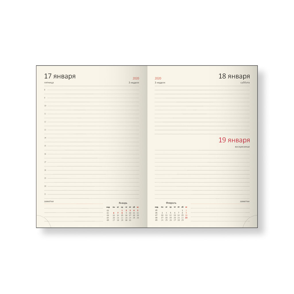 Обложка из высококачественного итальянского материала глянцевой гладкой фактуры, имитирующего натуральную кожу, с поролоном, по периметру отделочная строчка в цвет материала. Возможно нанесение логотипа на обложку любым способом тиснения. Блок: 336 страниц, тонированная бумага 70 г/кв.м, печать в 2 краски, перфорация уголка, закладка и каптал бежевого цвета. Дополнитальные разделы: личные данные, календарь на 2 года, план на год, планирование по месяцам, дни рождения, идеи подарков, полезные сервисы, службы, специалисты, алфавитный рубрикатор, заметки. |