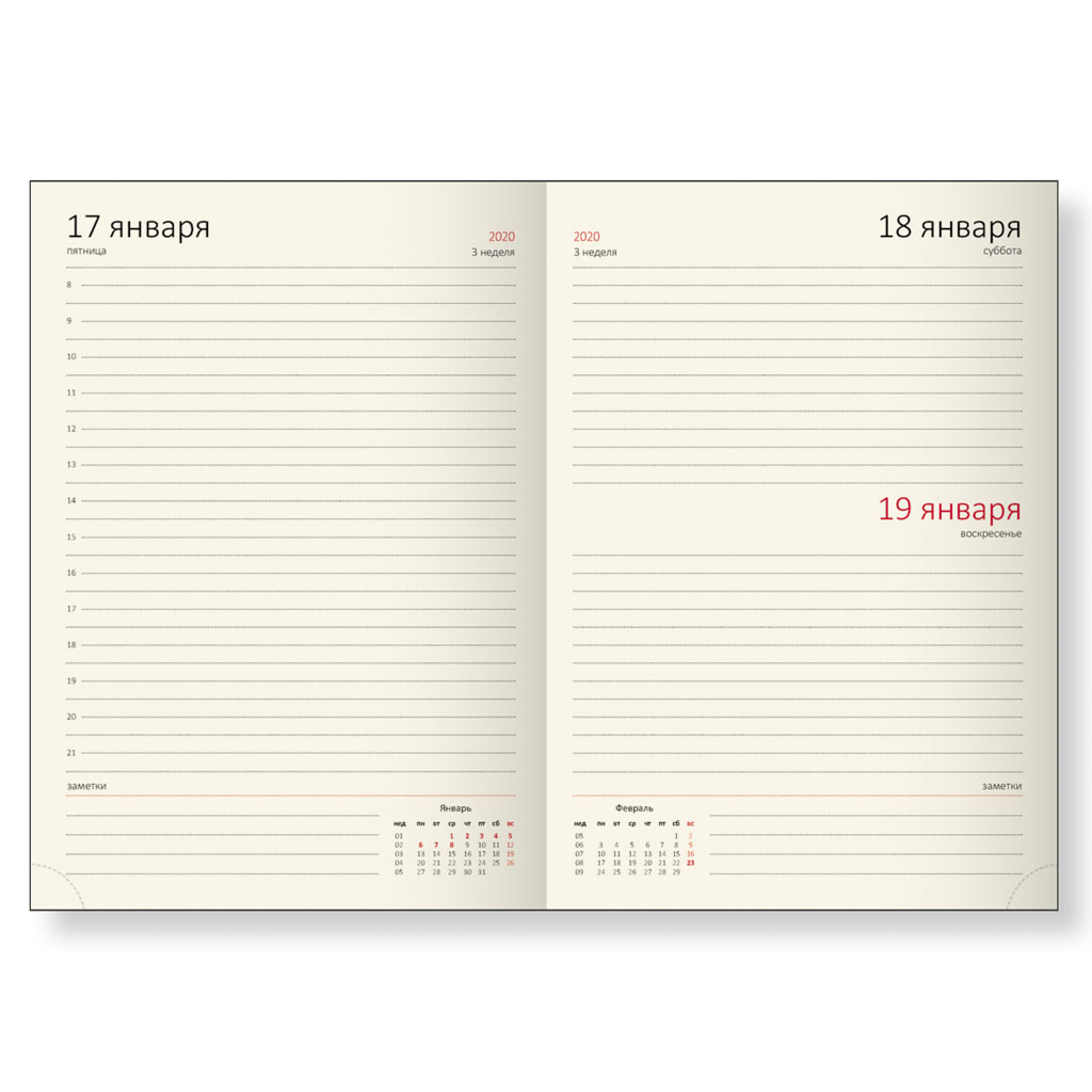 Обложка из приятной на ощупь итальянской искусственной кожи с выразительной оригинальной фактурой, с поролоном, глубокие и насыщенные цвета, по периметру отделочная строчка в цвет материала. Возможно нанесение логотипа на обложку любым способом тиснения. Блок: 336 страниц, тонированная бумага 70 г/кв.м, печать в 2 краски, перфорация уголка, закладка и каптал бежевого цвета. Дополнитальные разделы: личные данные, календарь на 2 года, план на год, планирование по месяцам, дни рождения, идеи подарков, полезные сервисы, службы, специалисты, алфавитный рубрикатор, заметки. |