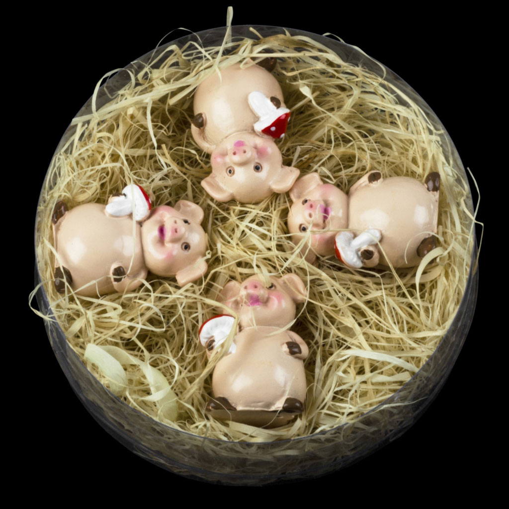 4 поросенка в наборе оснащены подковой на удачу и лежат в декоративном сене. Фигурки отличаются компактным размером. Можно использовать как символичный презент цельным набором, а также дарить поштучно. Упаковка - круглая коробка из ПВХ. |