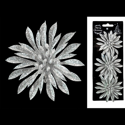 Набор состоит из трех серебряных цветков, выполненных из пластика. Диаметр каждого цветка 9 см. При помощи аккуратного металлического клипа, украшение легко крепится на еловую ветку. Также подходят для оформления интерьера. Упаковка - картонная подложка с европодвесом размещена внутри полибэга. |
