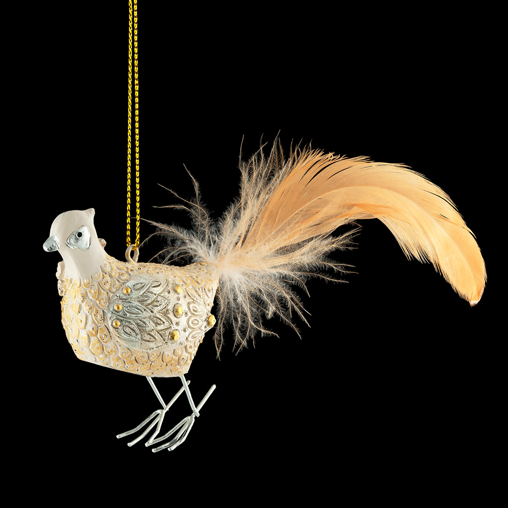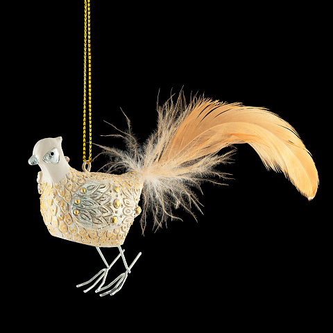 Птица выполнена в нежном цвете пастели, подчеркнутым золотыми вкраплениями и сверкающими блестками. Особенностью украшения является крупное пушистое перо на месте хвоста. Ножки выполнены из металла. Изделие имеет средний размер и отличается тонко прорисованными… |
