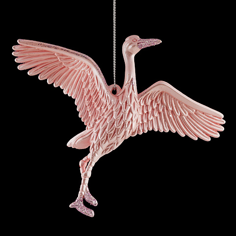Фигурка журавля выполнена в нежно-розовом цвете и частично присыпана перламутровыми блестками. Изделие имеет матовый финиш. Украшение подходит для декорирования елки и детских помещений. Упаковка - полибэг. |
