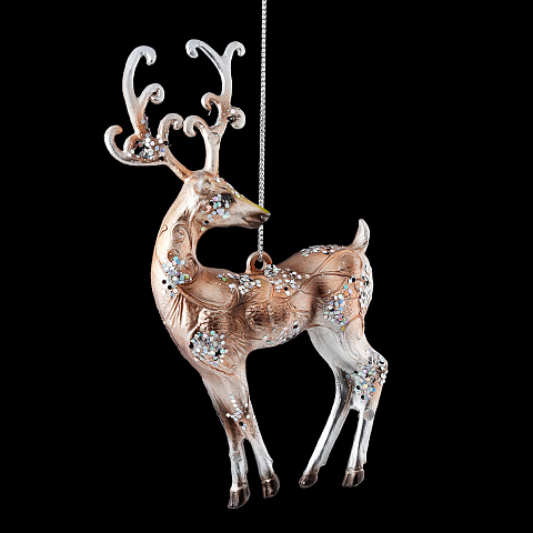 Олень отличается кофейно-золотистым цветом с глянцевым покрытием. Изделие декорировано черными сЛегкое и объемное, украшение подходит для натуральных и искусственных елок разного размера. Упаковка - полибэг. |