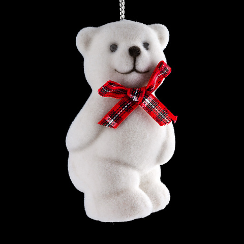 Белый медвежонок с бантиком на шее имеет легкий вес. Украшение выполнено из пластика, покрыто мягчайшим ворсом и декорировано сверкающими блестками. Подходит для елочного декора, а также для игр с детьми. Упаковка - полибег. |