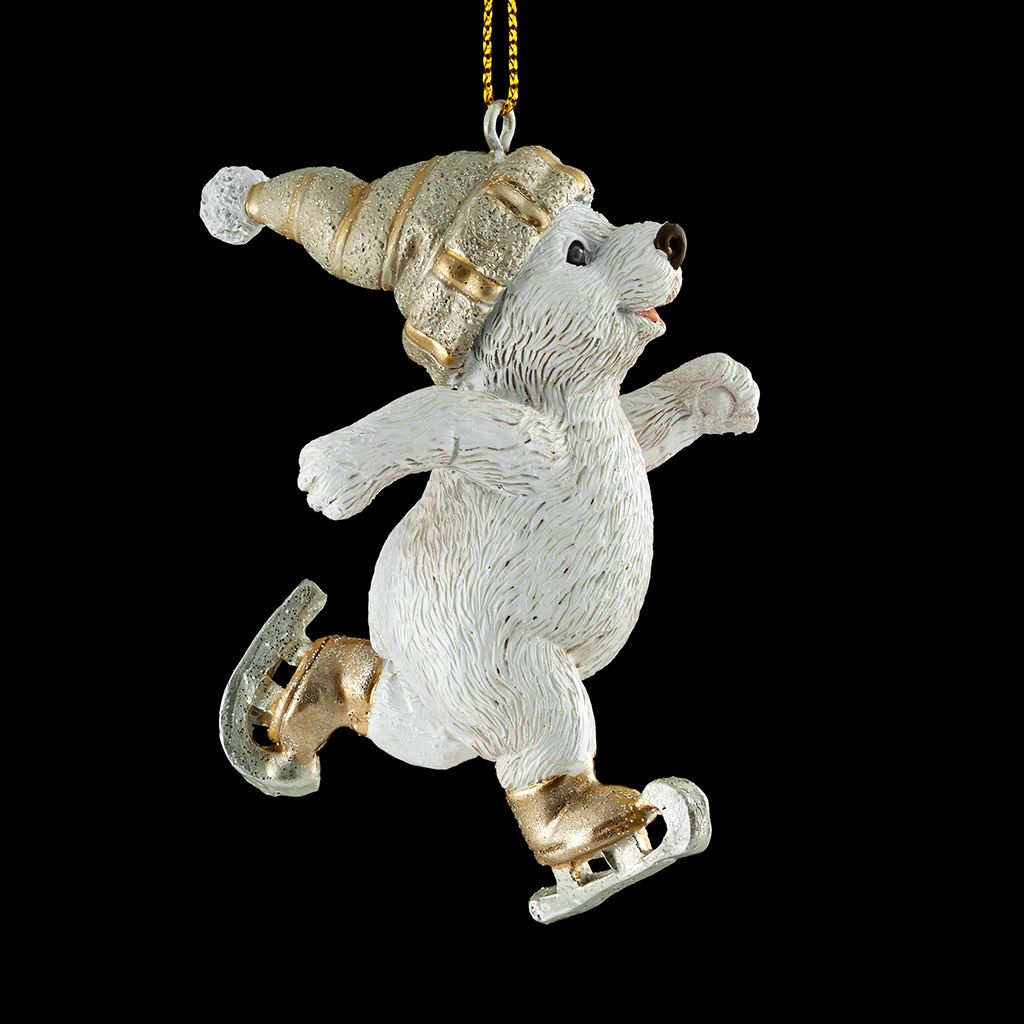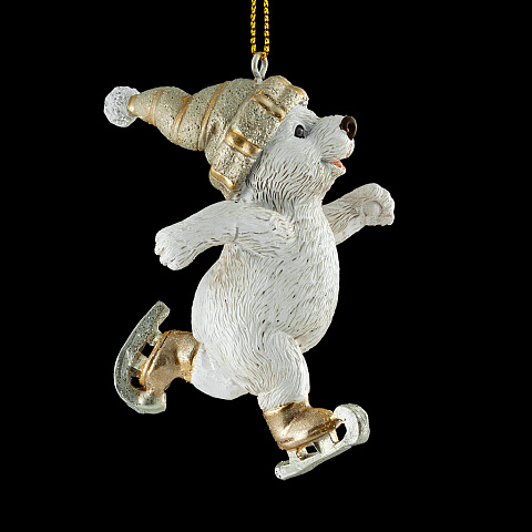 Белый медвежонок на коньках выполнен очень натуралистично. Коньки и шапка окрашены в золотой цвет и декорированы блестками. Украшение имеет средний размер и отличается тонко прорисованными деталями. Групповая упаковка предназначена только для безопасной транспортировки… |