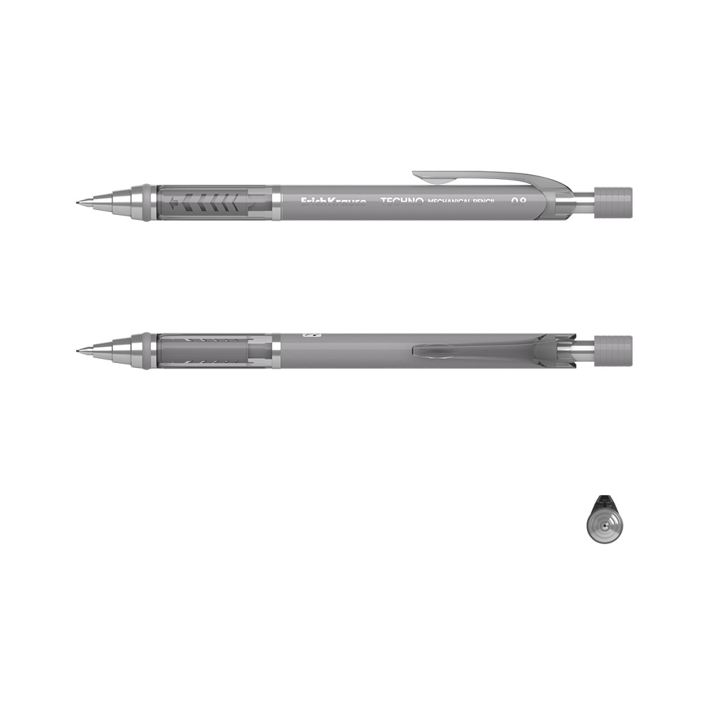 Механический карандаш круглой формы с профилированной зоной упора, металлической цангой и автоподачей грифеля. Корпус в двух цветах - темно-графитовый и светло-графитовый. Оснащен ластиком, закрывающимся колпачком и удобной полупрозрачной клипсой. Твердость ТМ. Диаметр грифеля - 0.9 мм. |