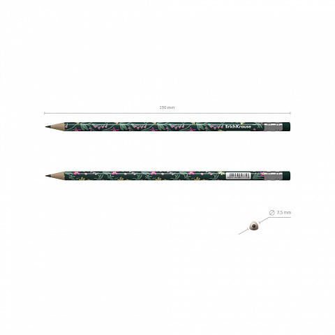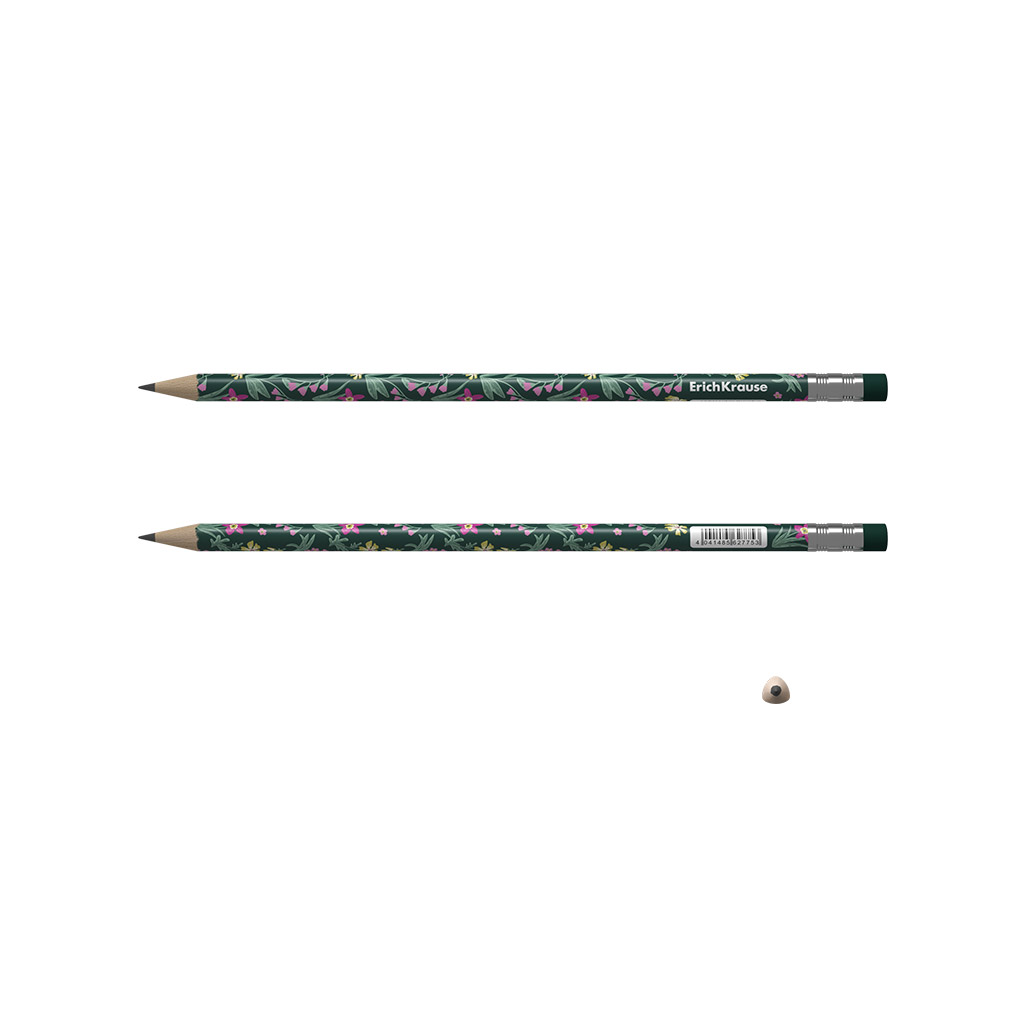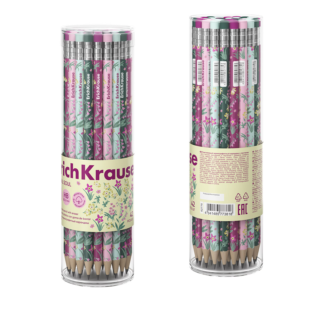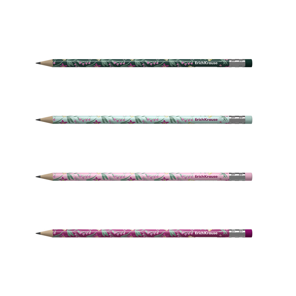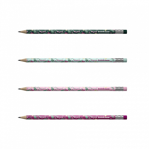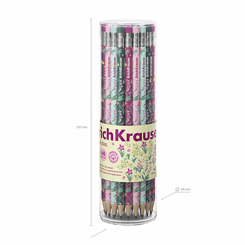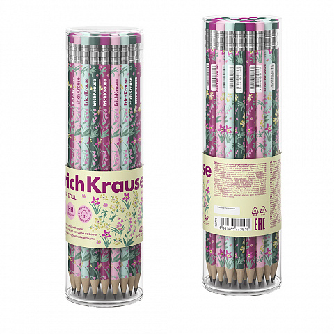 Чернографитный карандаш пластиковый ErichKrause Floral Soul, круглый, с ластиком, НВ (в тубусе по 42 шт.) |