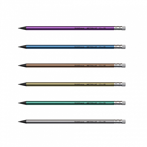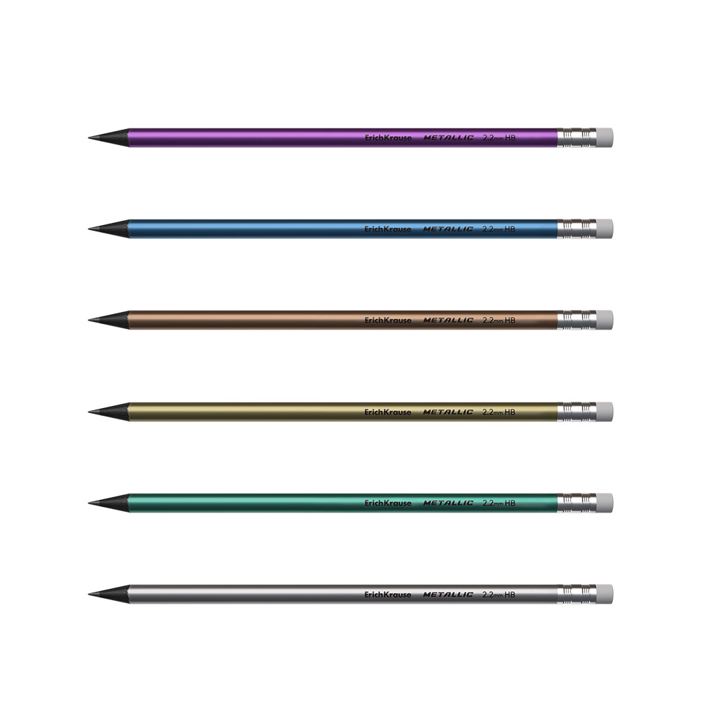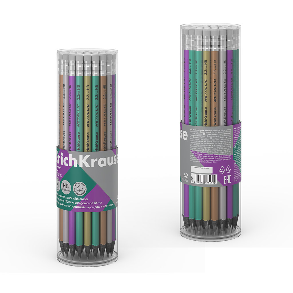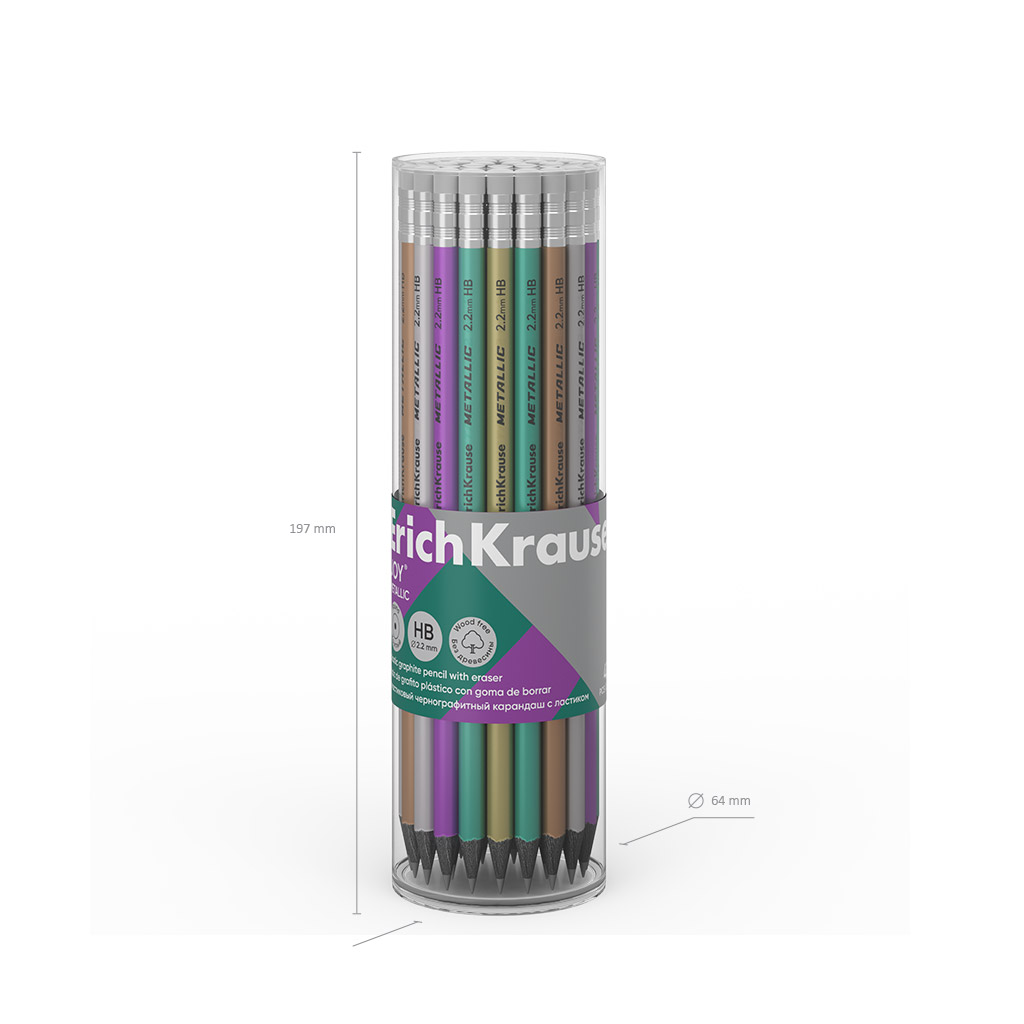 Чернографитный карандаш пластиковый ErichKrause JOY® Metallic, круглый, с ластиком, HB (в тубусе по 42 шт.) |