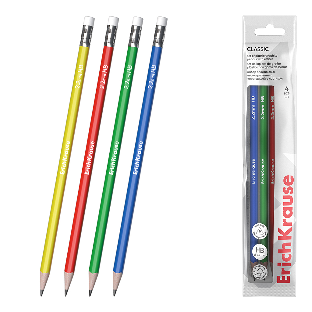 Набор из 4 чернографитных карандашей пластиковых ErichKrause Classic triangle, трехгранных, с ластиком, HB (в пакете)