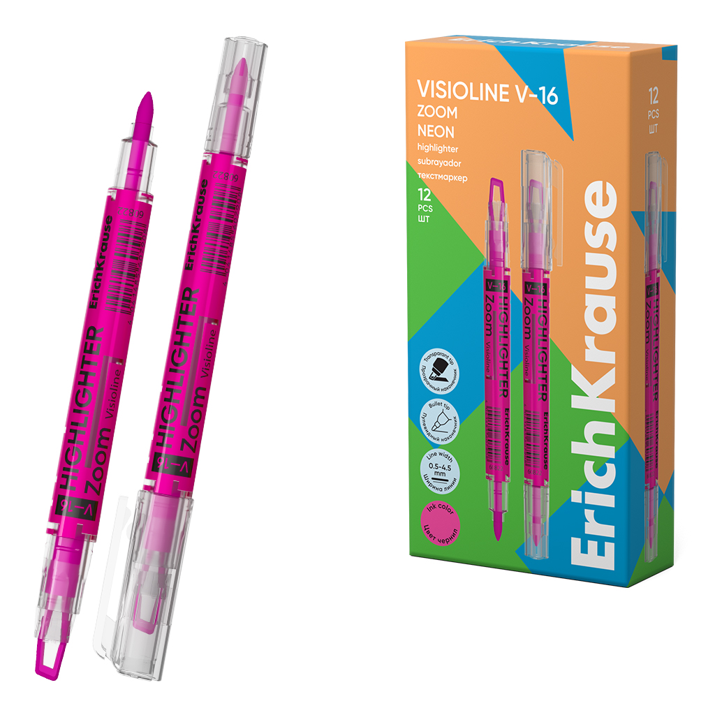 | Полное наименование товара: | Двухсторонний текстмаркер ErichKrause Visioline V-16 Zoom Neon, цвет чернил розовый (в коробке по 12 шт.) |
