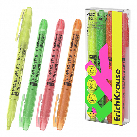 | Полное наименование товара: | Набор из 4 текстмаркеров ErichKrause Visioline V-15 Neon Shine, цвет чернил ассорти (в пэт-боксе) |
