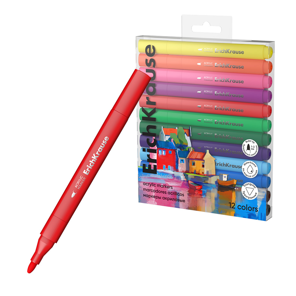 Маркеры акриловые ErichKrause Art Spirit c пулевидным наконечником 12 цветов (в ПЭТ-боксе с европодвесом 12 шт) |
