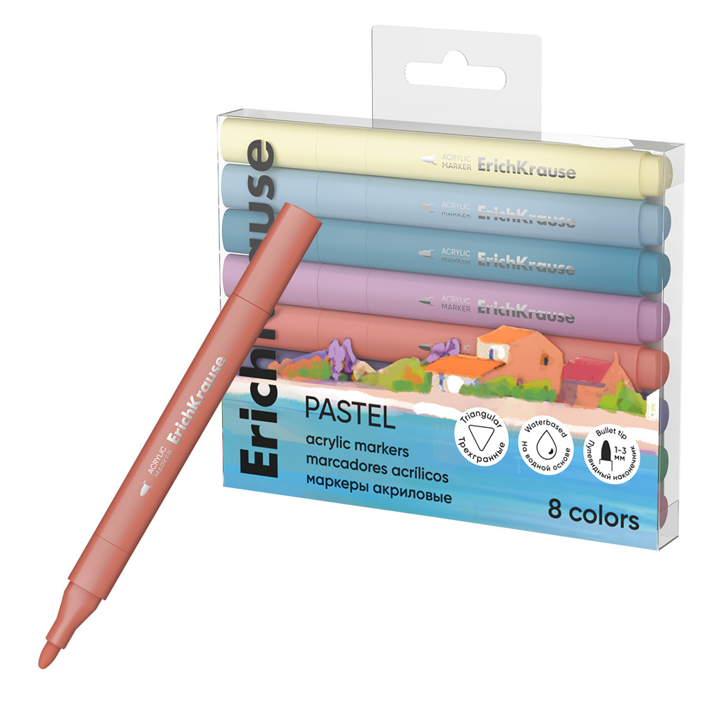 Маркеры акриловые ErichKrause Art Spirit Pastel c пулевидным наконечником 8 цветов (в ПЭТ-боксе с европодвесом 8 шт)