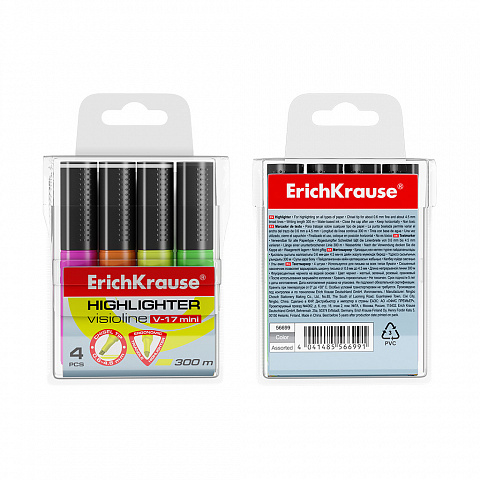 Набор из 4 текстмаркеров ErichKrause Visioline V-17 Mini Neon, цвет чернил: желтый, зеленый, розовый, оранжевый (в пвх-воллете) |