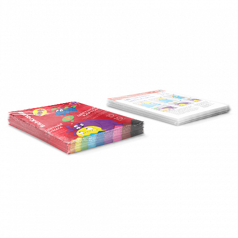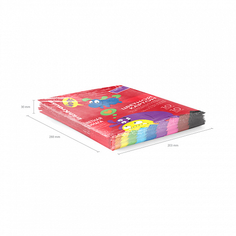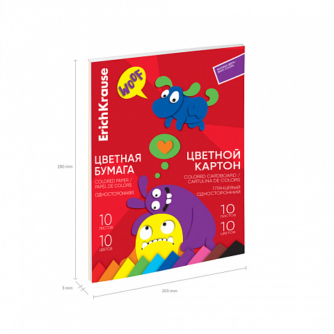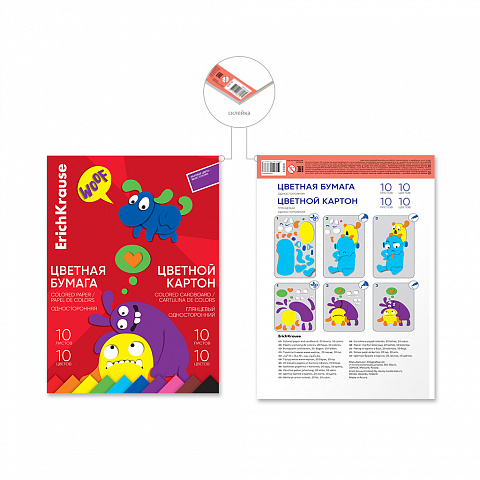 Набор цветной бумаги мелованной односторонней и картона глянцевого одностороннего формата А4 (203х280 мм). В наборе 20 листов бумаги и картона 10 базовых цветов (красный, оранжевый, желтый, зеленый, голубой, синий, фиолетовый, розовый, коричневый, черный). Плотность наполнения: бумага - 80 г\м2, картон — 170 г/м2. Тип скрепления — клей. На внутренней стороне обложки приводятся инструкции по изготовлению поделок. Упакована в термоусадочную пленку по 10 штук. |