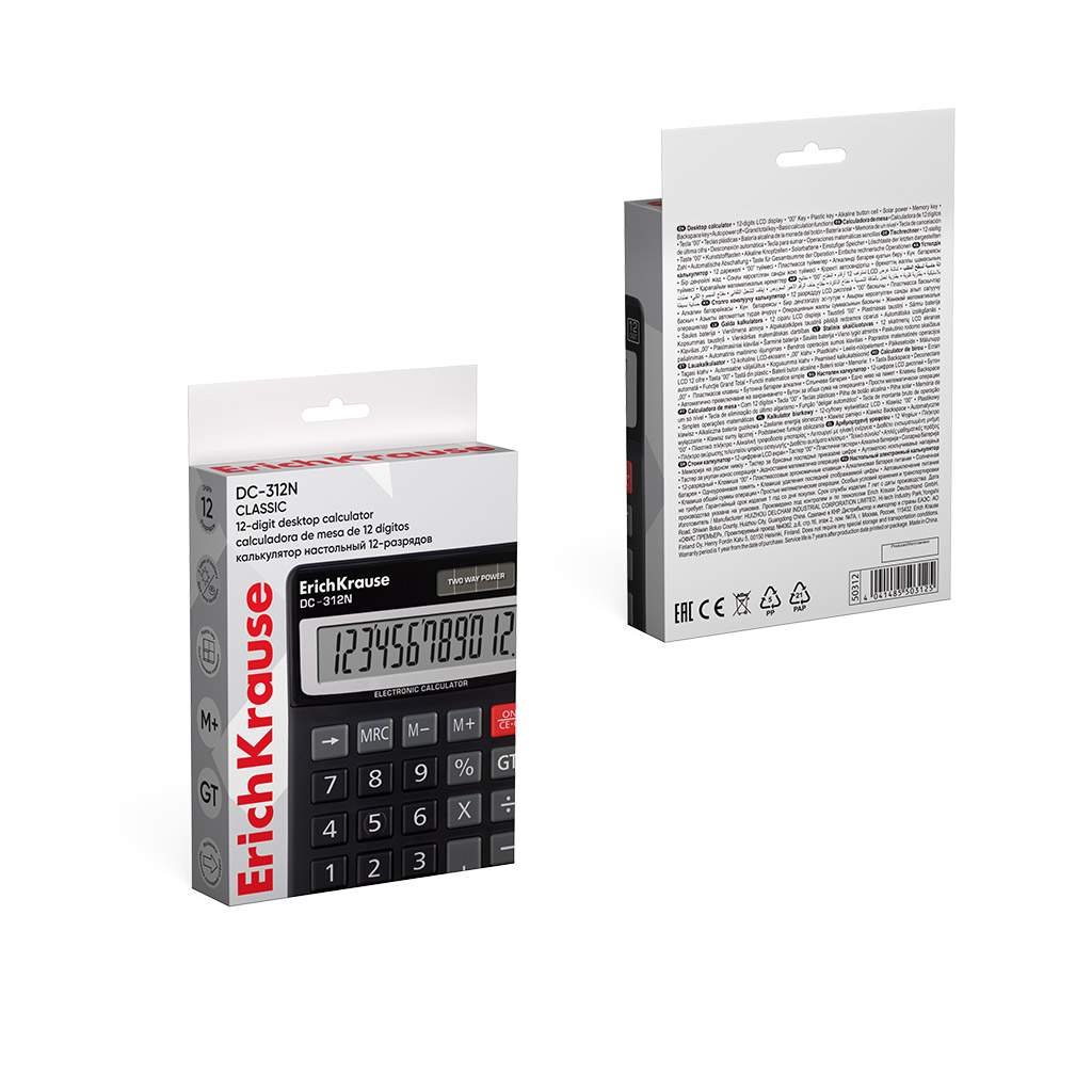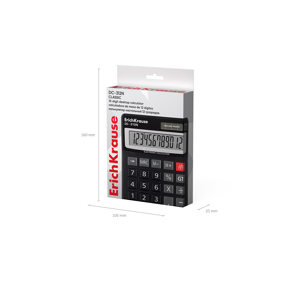 Калькулятор настольный 12-разрядов ErichKrause DC-312N Classic, черный (в коробке по 1 шт.) |