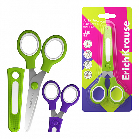 Ножницы для левшей ErichKrause Junior Protect с пластиковым чехлом и именным стикером, 13см, ассорти (в блистере по 1 шт.) |